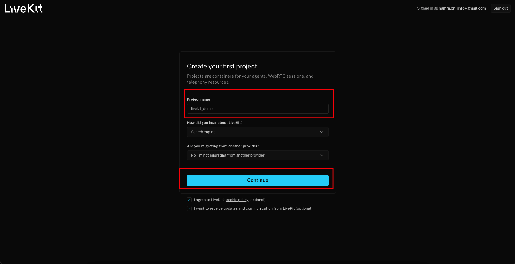 - Enter a project name (for example: livekit_demo) and click Continue.