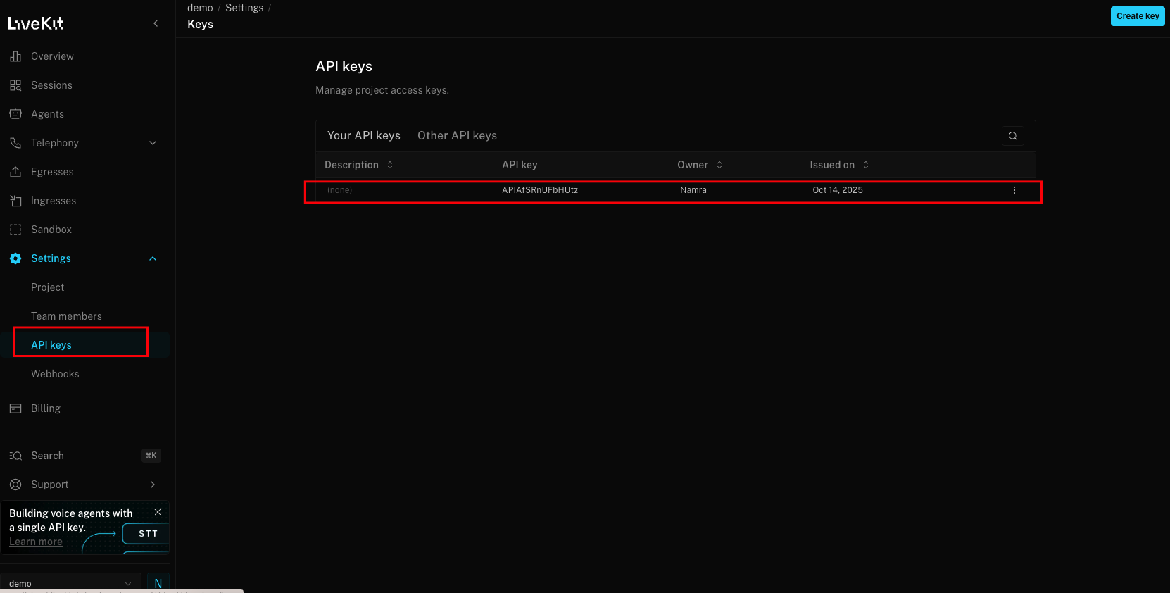 LiveKit Cloud Setup (API Key, Secret & Websocket URL)