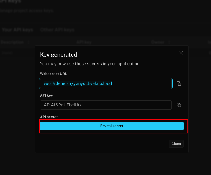 - Websocket URL (e.g. wss://demo-xxxxxx.livekit.cloud)