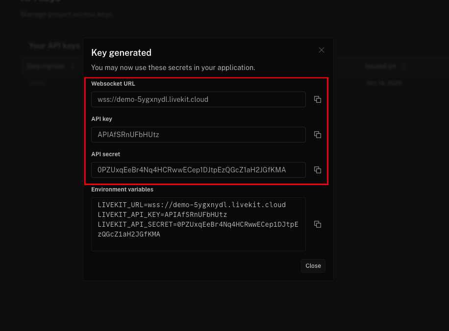 - Use this quick guide to generate credentials in LiveKit Cloud and copy the values you’ll need in your app.