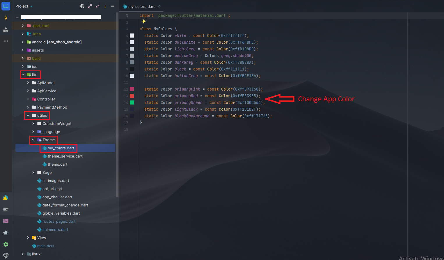 - Go to your project lib > utils > color_res.dart as shown in the below image.