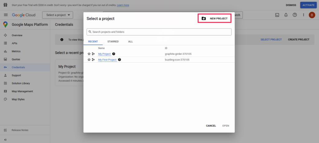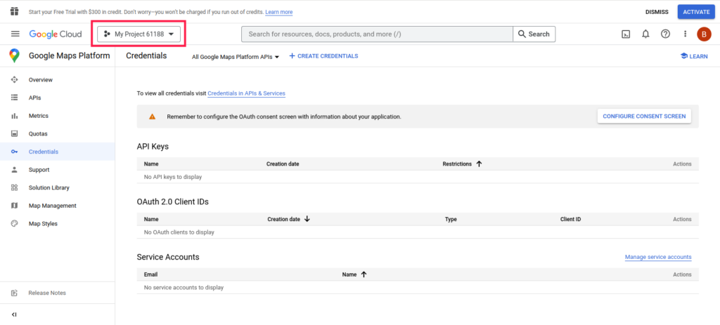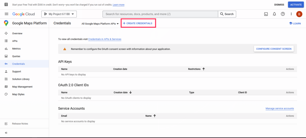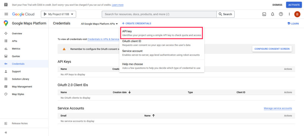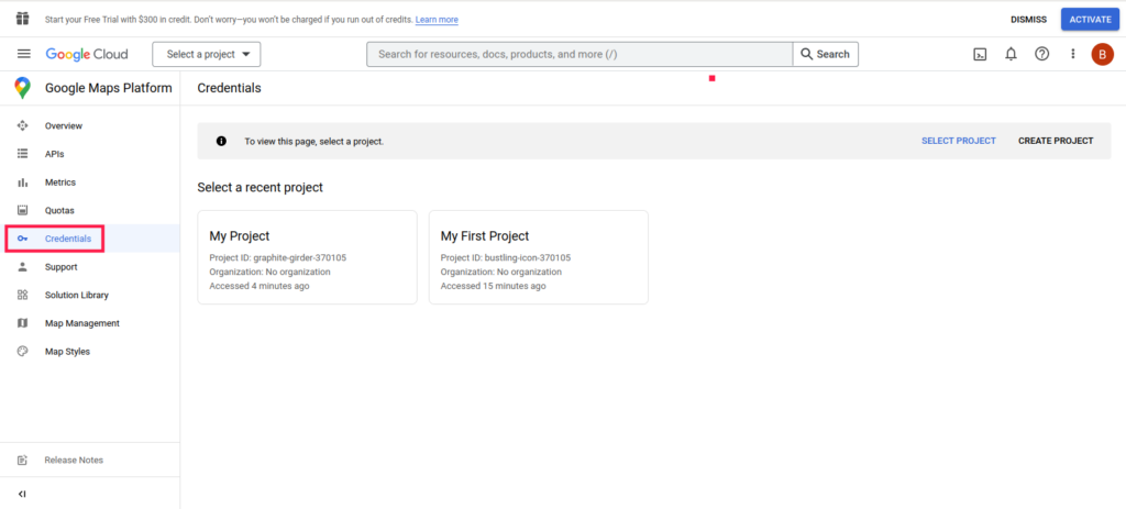 - Navigate to Google Maps Platform > Credentials. We’ve included a screenshot below.