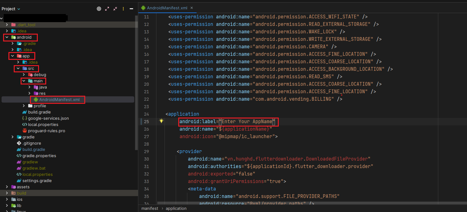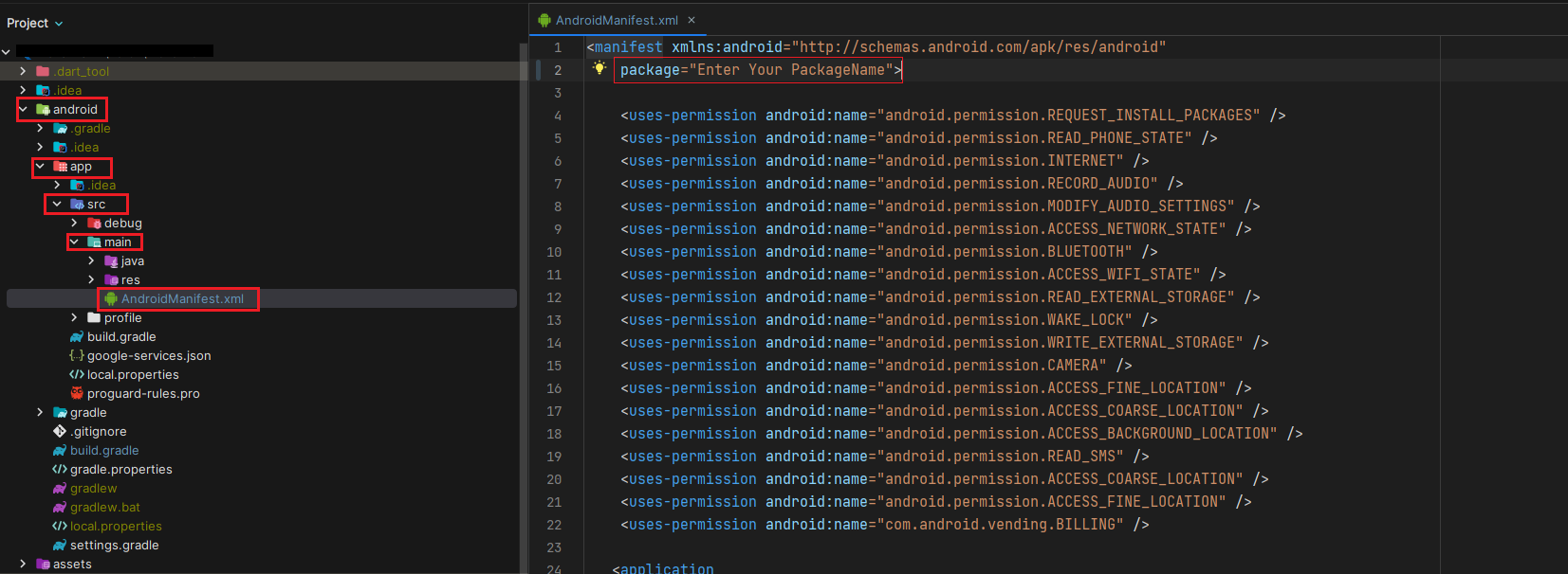 - Navigate to "android/app/src/main/AndroidManifest.xml" and make the changes as depicted in the provided image.