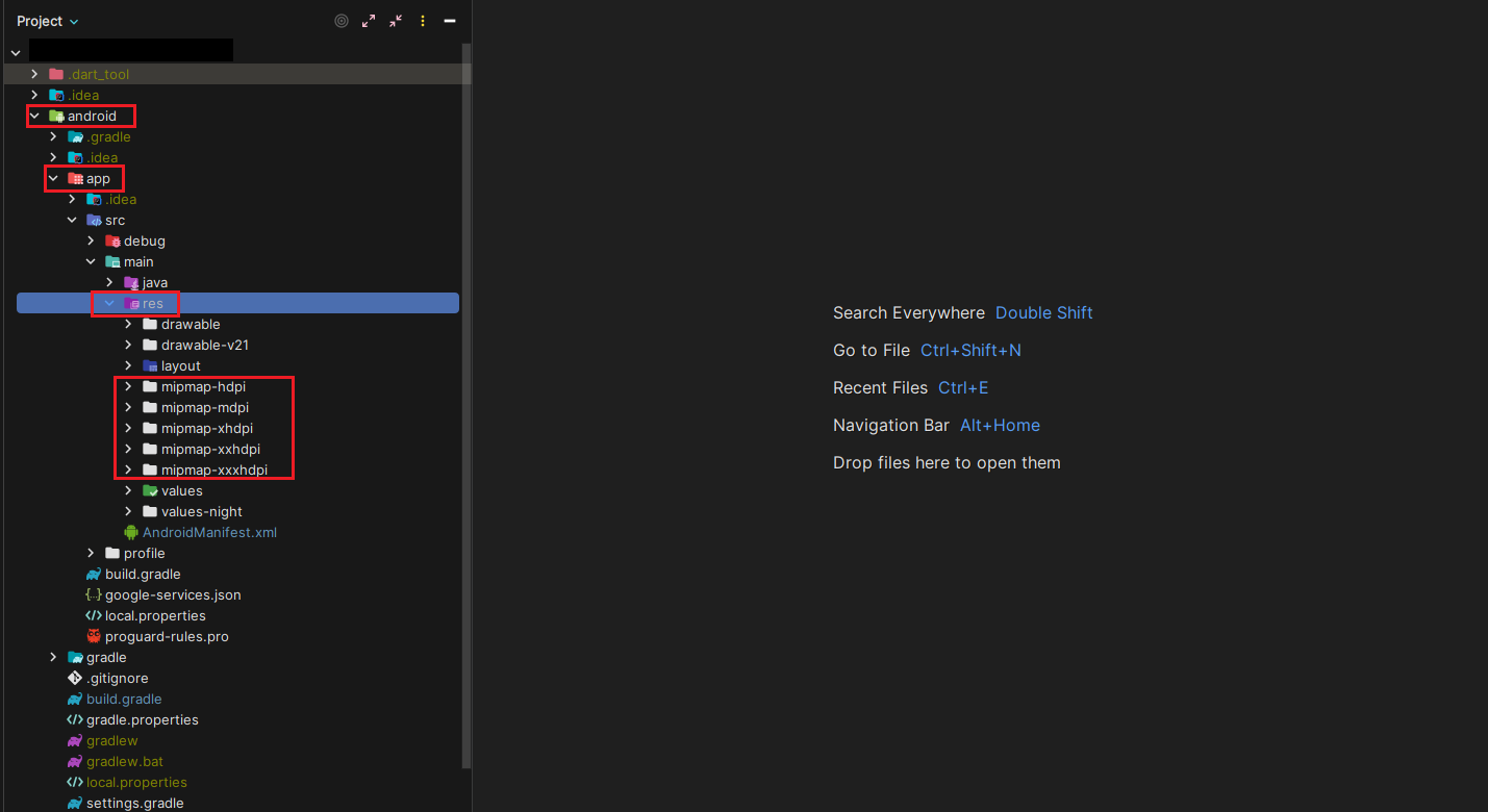 - Navigate to the "android/app/src/main/res" directory in your project. Right-click on the "res" folder and select "open in Finder". Once in Finder, delete all the existing mipmap folders. Then, paste the mipmap folders from the AppIcon/android directory that you have downloaded.
