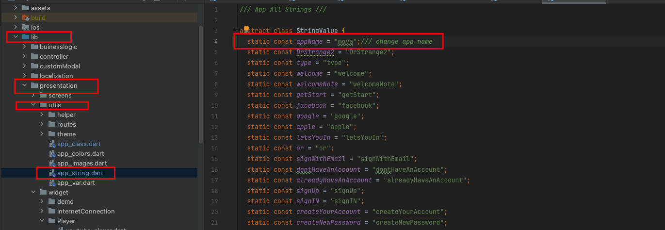 - Navigate to "lib > utils > string > app_string.dart" and make changes shown in the below image.