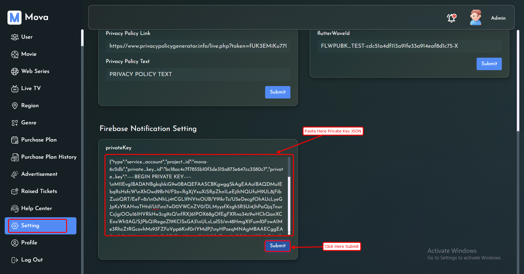 - Please Copy content of private key .json file and update in the 'Private Key' section of the Firebase Notification settings.