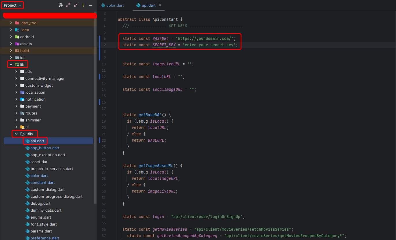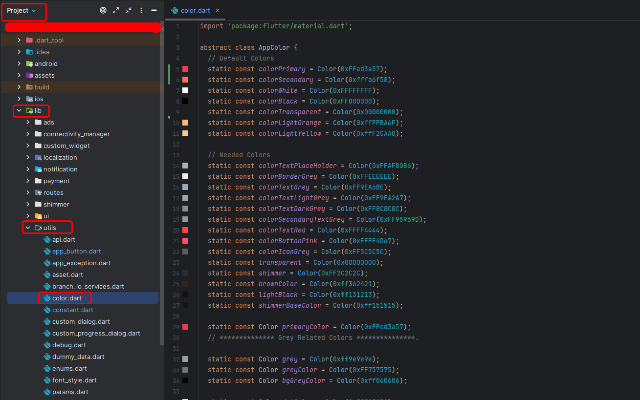 - Go to your project lib > utils > color.dart as shown in the below image.