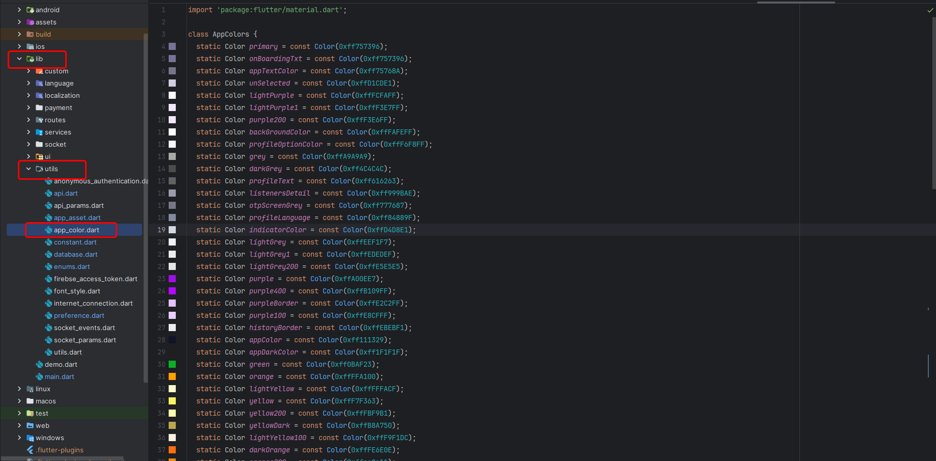 - Go to your project lib > utils > app_color.dart as shown in the below image.