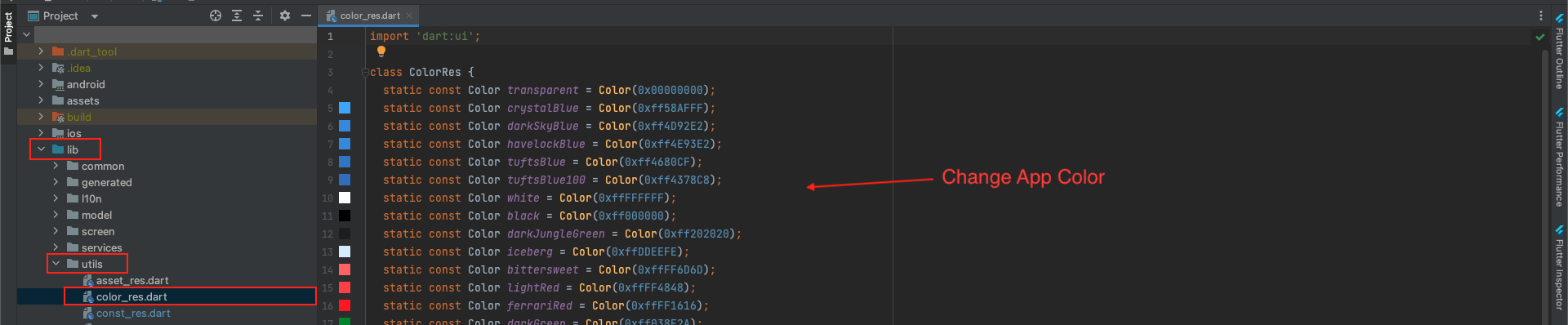 - Go to your project lib > utils > color_res.dart as shown in the below image.