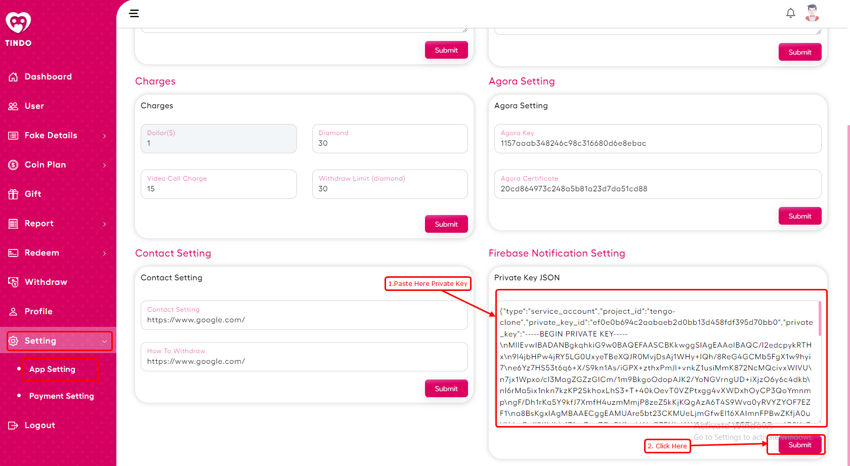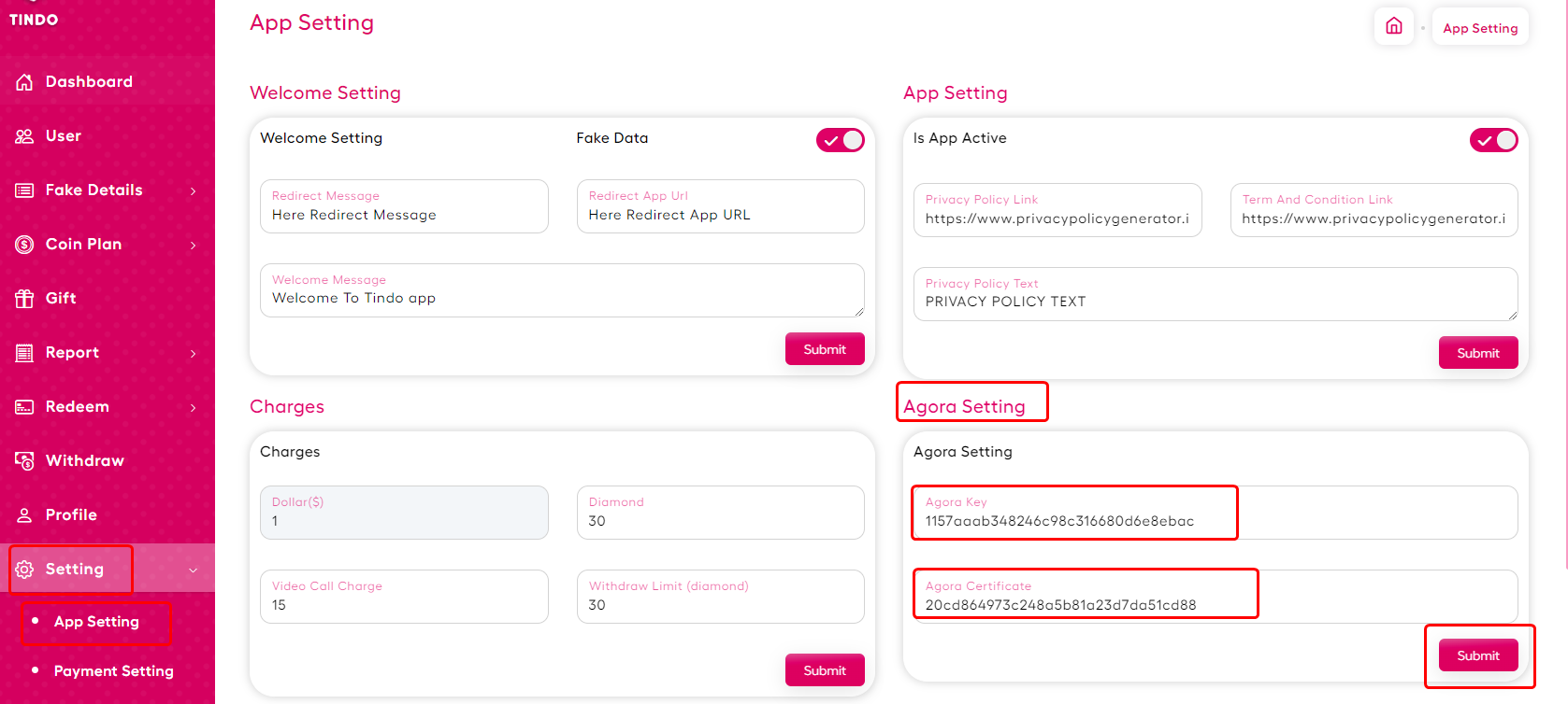 - Enter the Agora Key and Agora Certificate In details in the admin panel under the settings section.